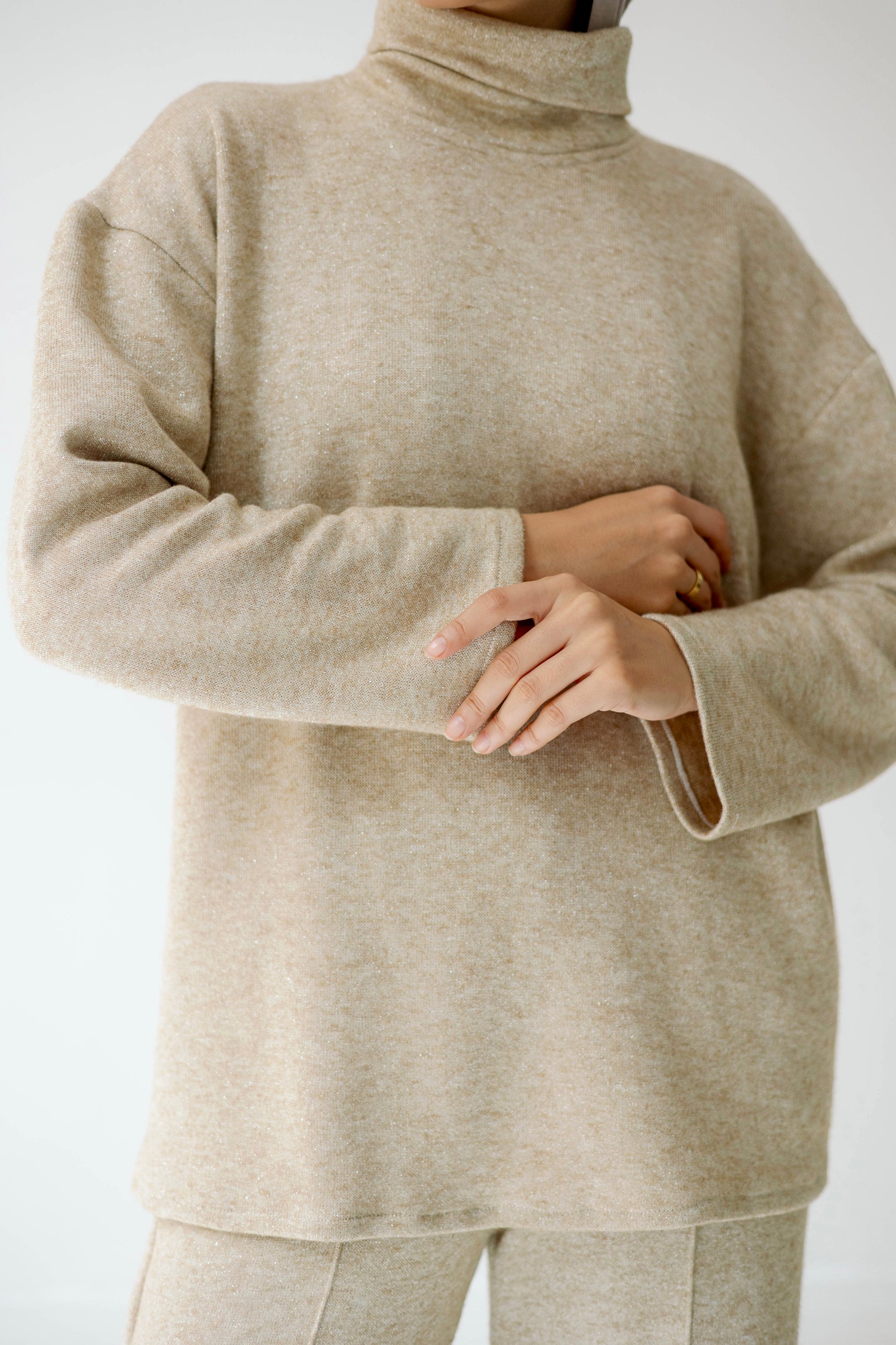 The set features a relaxed-fit turtleneck top with dropped shoulders and a straight-leg cozy pant, making it the perfect balance look between minimalism and effortless chic.