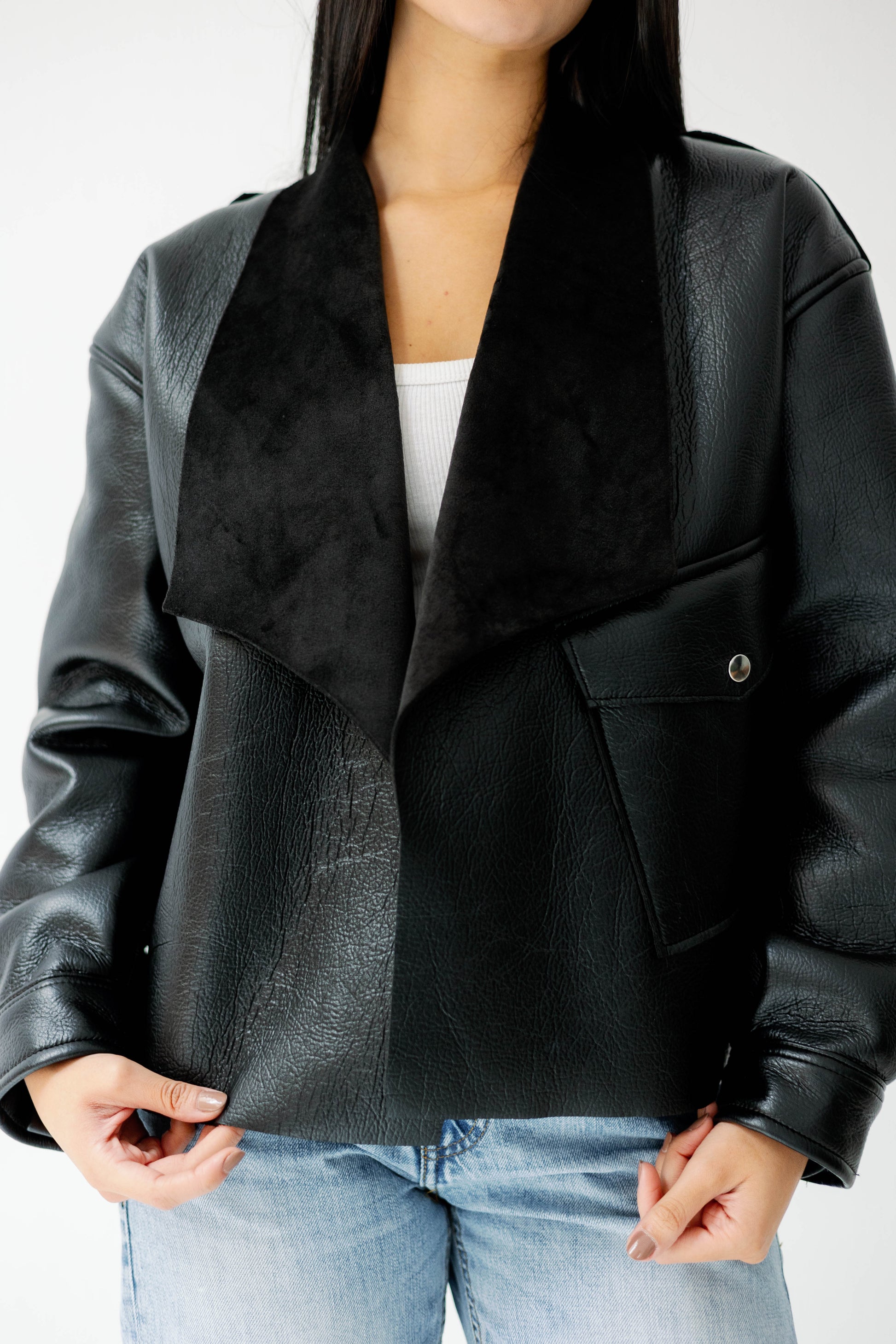 The suede lining extends to the oversized folded collar and lapel, adding a soft, luxurious contrast without making the jacket reversible. The inside padding ensures warmth and comfort — no need for heavy layering underneath.