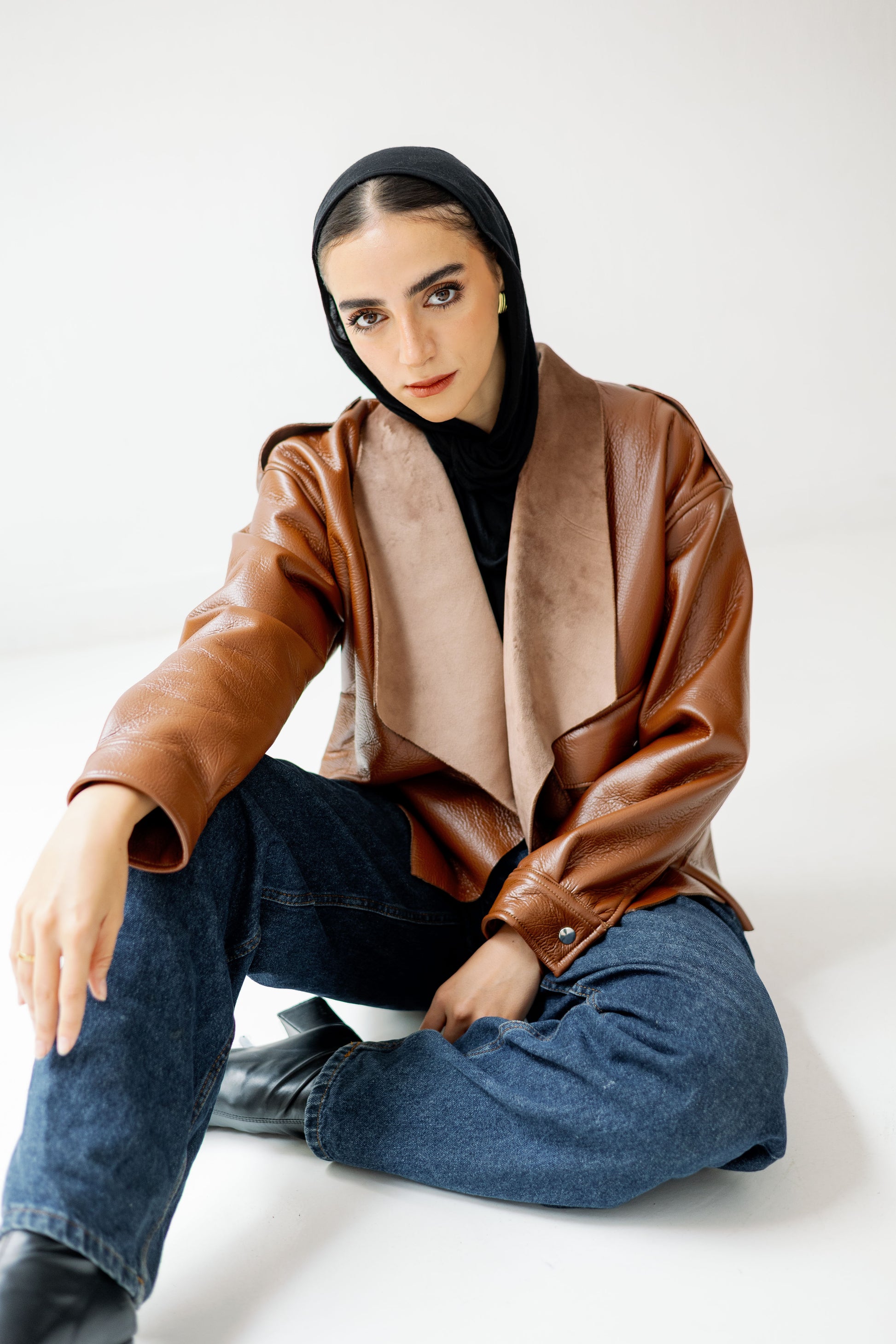 The suede lining extends to the oversized folded collar and lapel, adding a soft, luxurious contrast without making the jacket reversible. The inside padding ensures warmth and comfort — no need for heavy layering underneath.